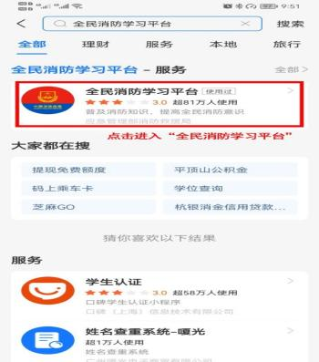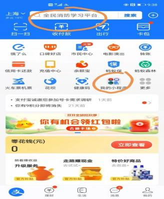 第一步:进入支付宝页面搜索“全民消防学习平台”小程序