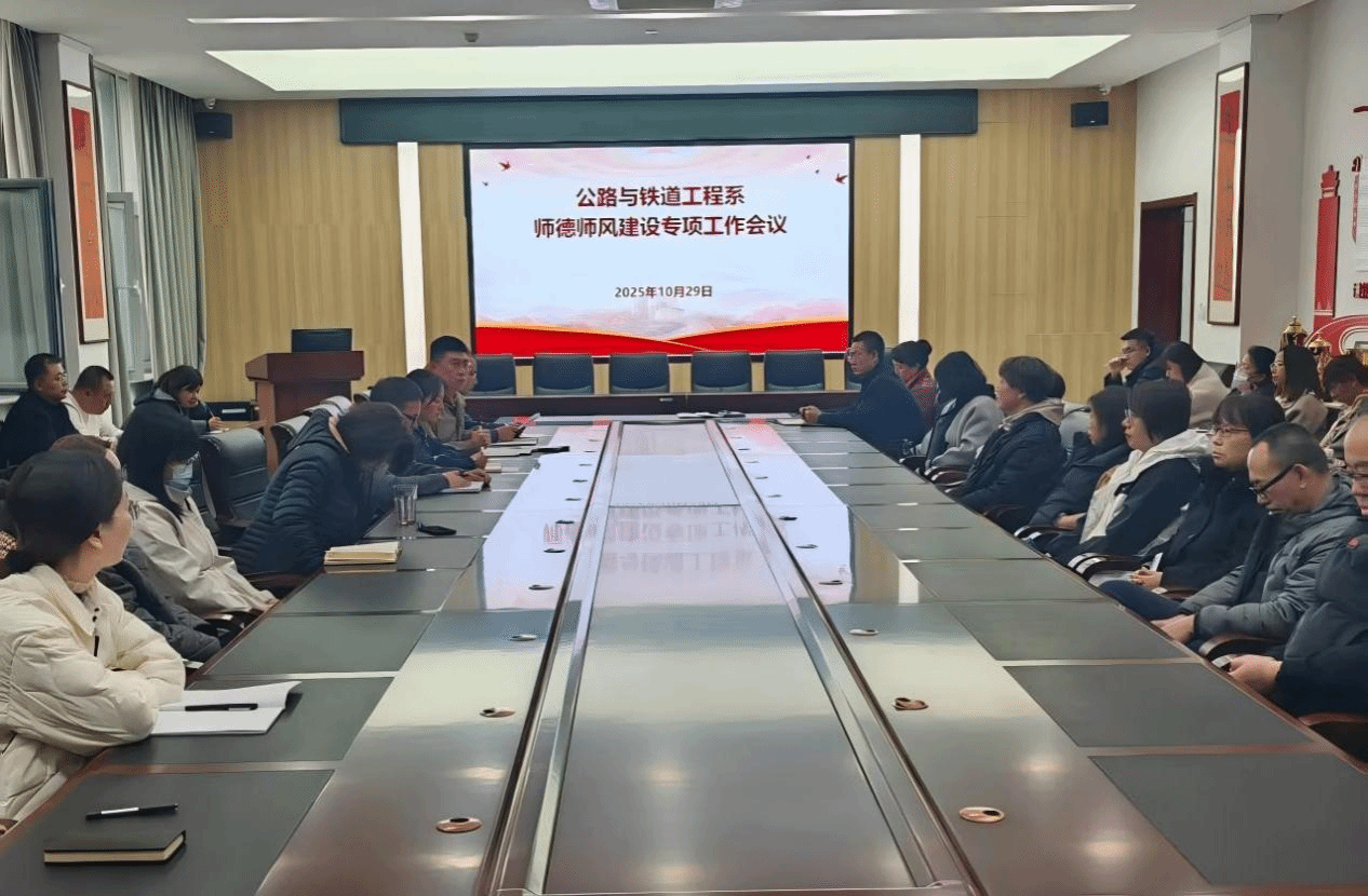 为深入贯彻落实学校师德师风建设工作部署,严明教师职业纪律,营造风清气正的育人环境,10月29日,公路与铁道工程系召开全系师德师风建设工作会议。会议内容包括集中学习《新时代高校教师职业行为十项准则》、开展师德负面典型案例警示教育、进行师德专项工作部署、与教师签订师德师风承诺书四项。本次会议导向鲜明,掷地有声,切实推动师德师风建设走深走实。会议由系党总支书记鲁嘉主持,全系教职工参会。