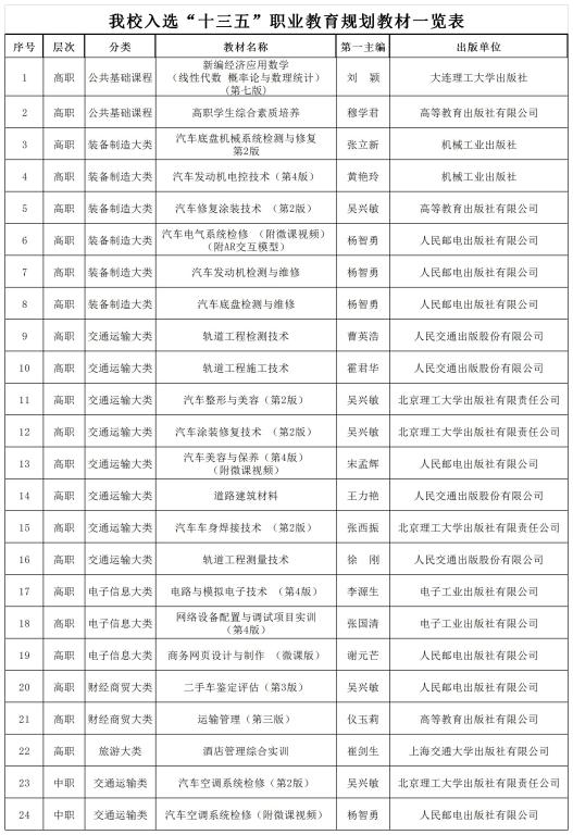 近日,教育部办公厅印发《关于公布“十三五”职业教育国家规划教材书目的通知》(教职成厅函[2020]20号),共有560所高职院校作为第一主编单位编写的教材入选“十三五”职业教育国家规划教材,我校共有22部教材入选“十三五”职业教育国家规划教材(高职层次),入选数量位列全国第五。另有2部教材入选“十三五”职业教育国家规划教材(中职层次)。