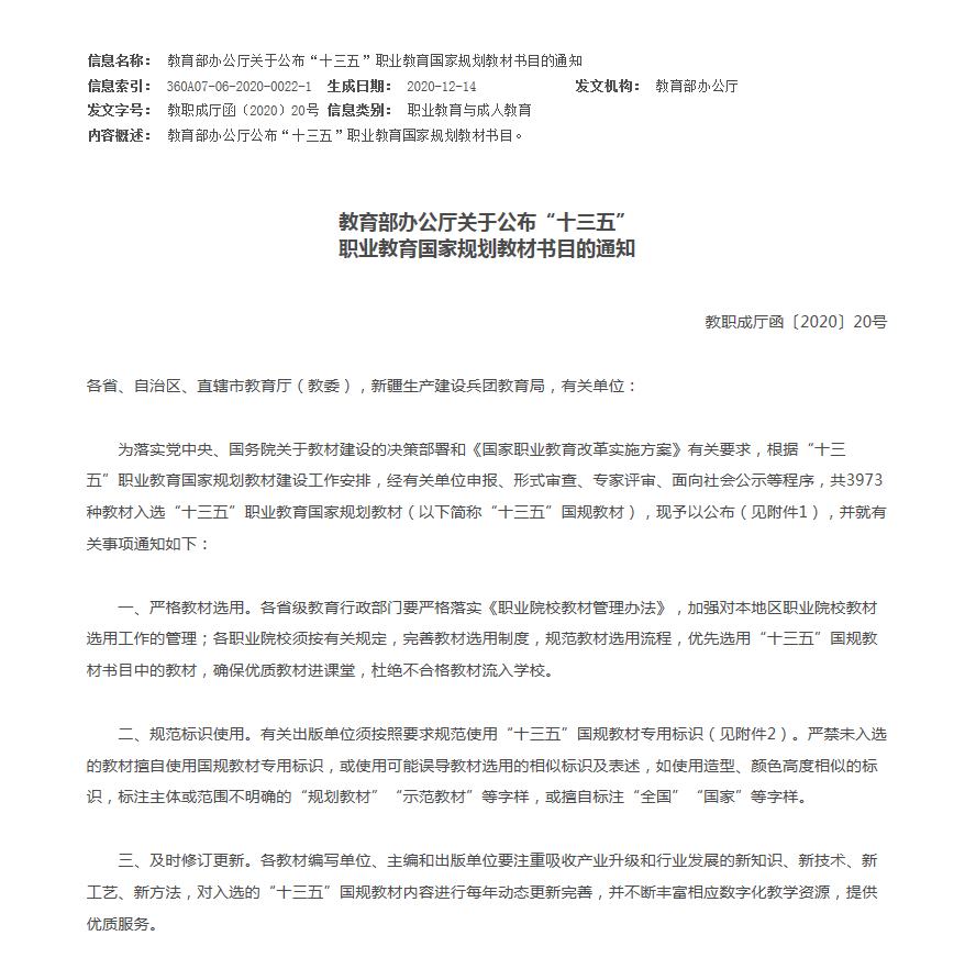《教育部办公厅关于公布“十三五”职业教育国家规划教材书目的通知》