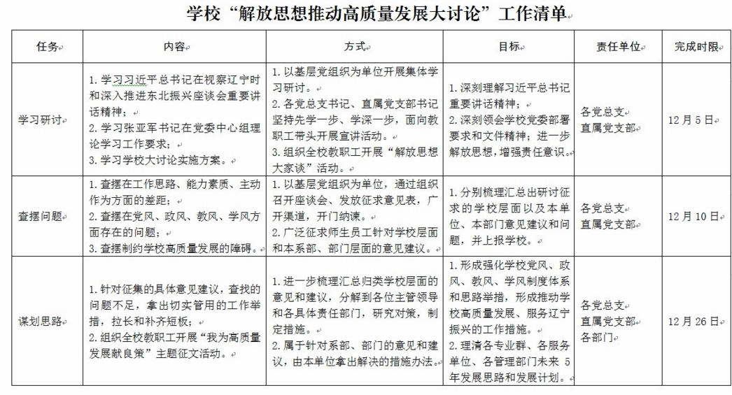 按照学校党委《关于在全校开展“解放思想推动高质量发展讨论”实施方案》的相关要求,请各党总支(直属党支部)、各部门围绕学校“解放思想推动高质量发展大讨论”工作清单中的“学习研讨、查摆问题、谋划思路”三项工作任务认真组织开展大讨论有关活动。 请结合工作清单中列出的工作内容,按照完成时限的要求按时完成各项工作任务,并将有关意见建议整理后报党委宣传统战部。 联系人:周媛媛 电话:13840567028(668816)