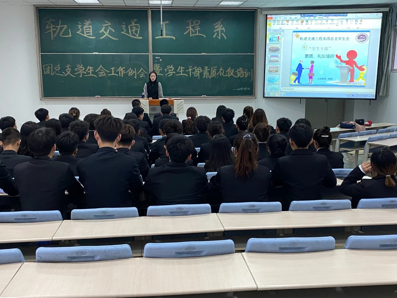2021年4月11日下午4:20,轨道交通工程系于C阶二召开团总支学生会工作例会暨学生干部素质礼仪培训,参与本次会议的有团总支书记杨丽以及各部门学生干部,本次会议由杨丽老师主持。