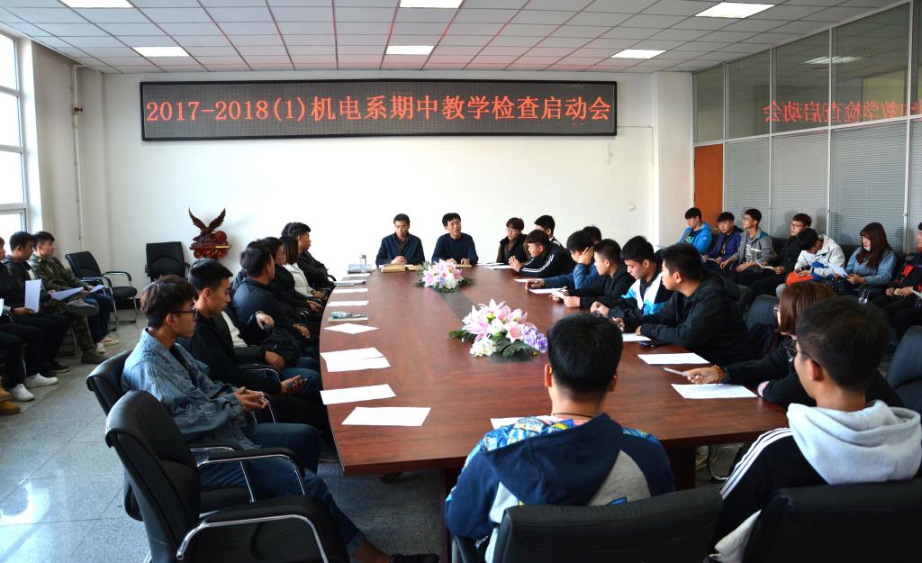 2017年11月8日 下午,机电系在机电楼四楼会议室召开“2017-2018(1)期中教学检查启动会。教学办主任许光君主持会议,16、17级班委成员参会。会上,许主任传达期中教学检查的相关学风、评教活动内容、要求以及注意事项,布置教学检查相关工作,强调公平、公正、公开的检查原则,客观、准确反映教师在教学过程中尚要进一部提高的地方。会议为本学期期中教学大检查工作拉开了序幕,为全面、周全、细致开展本学期期中教学工作奠定了基础,以确保检查质量。