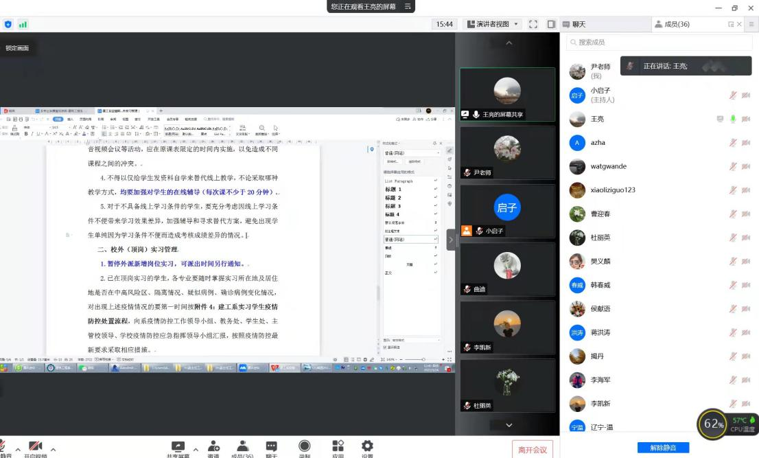 按照学校《关于全面启动线上教学及教学进程调整的通知》和《关于全面加强线上教学过程管理的通知》的要求和工作部署,建筑工程系于2022年3月24日中午,使用腾讯会议的方式召开了全系会议,系部所有教师参会。会议由系主任尹晶主持。