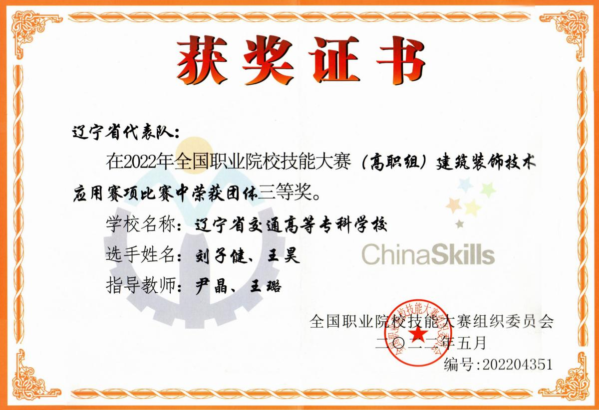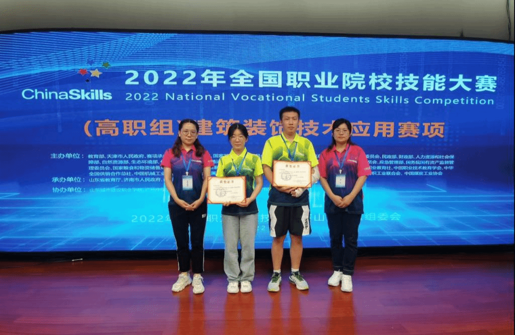 2022年8月25日至26日,全国职业院校技能大赛建筑装饰技术应用赛项在山东济南举行。共有来自全国各省市57所高职院校参赛。我两位老师尹晶、王璐指导的学生刘子健、王昊荣获团体三等奖。
