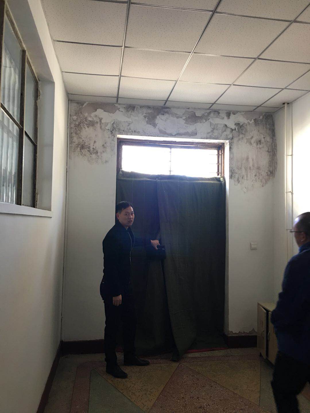 (2)B、C座教学楼窗帘较脏(图6),长时间无人清洗。A座、C座一楼及403教室有几个地方墙面破损严重需要粉刷(图7)。
