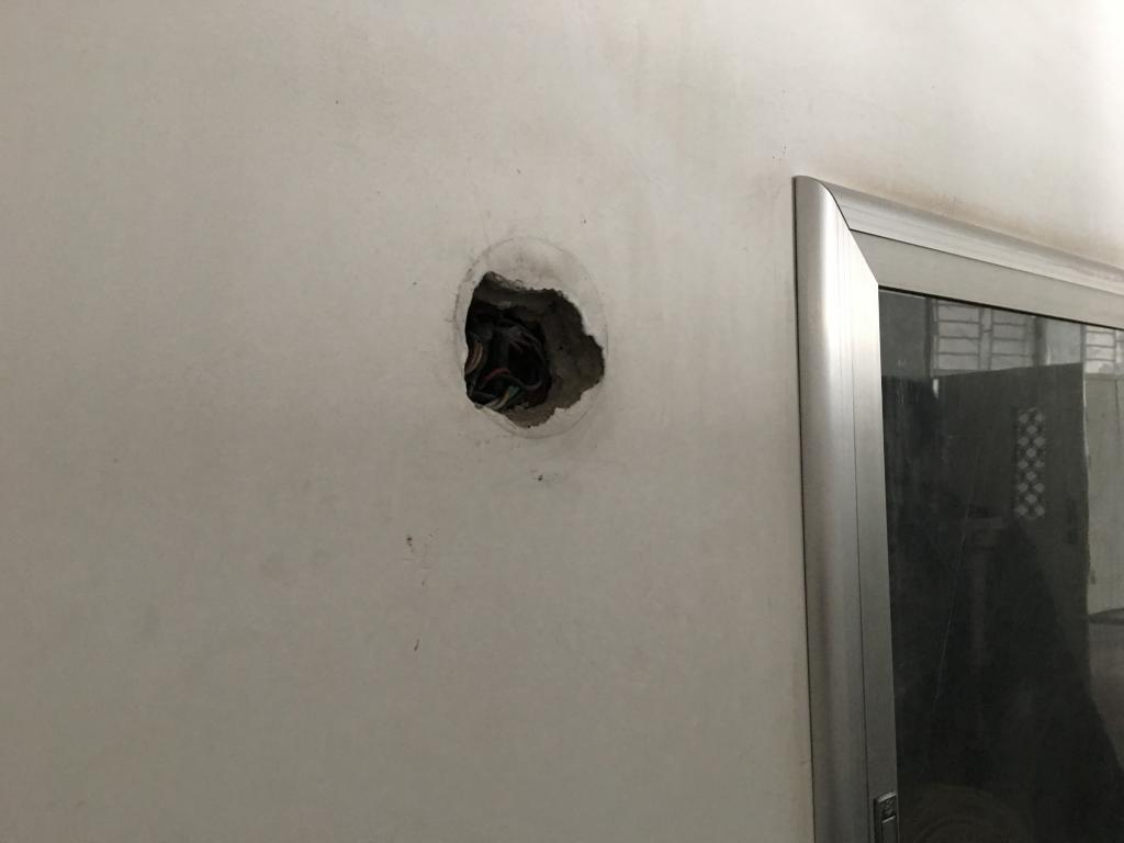(4)当即沟通解决的问题是B、C座大厅入门理石墙有大面积的粘贴痕迹(图8),当即沟通保洁清洗;C座多处电线盒裸露(图9),当即沟通电工进行封合。纠正一处在消防栓箱中存放保洁垃圾袋的问题。