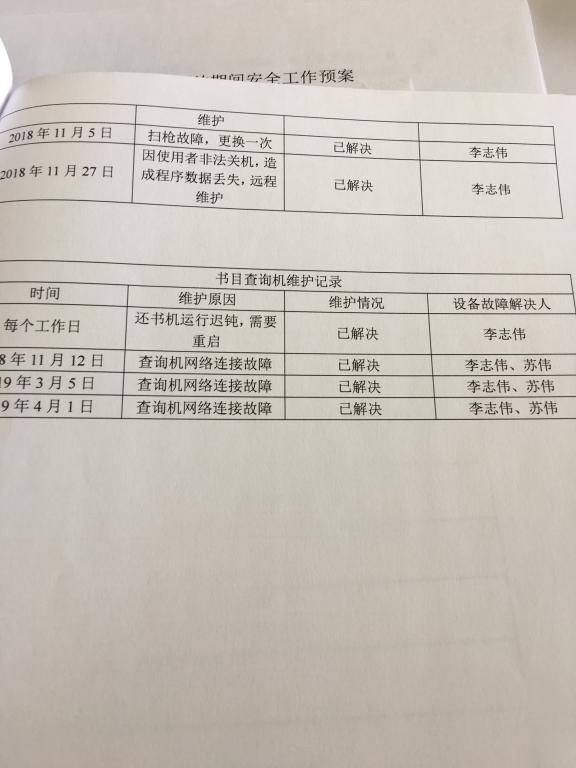 2.图书馆的自助借还设备、空调设备、电子显示阅读设备、网络设备及电子数据库等设备设施大都属高科技产品,要求负责的工作人员有较强的责任心、有钻研业务研究问题的精神和一定的动手能力,建议多加培训和组织学习。建议对设备设施的维护维修要单项单表,装订成册,而不是查核时统一报表。建议注明建设时间、保修期限和联系单位的联系方式、维护和修理记录等,并在记录中注明维修事项,以备后续维保和提前报请供应商或学校有关部门做好维修和更新计划。建议注重维护保养,多加检视和巡查,保养和维护也应按时记录。