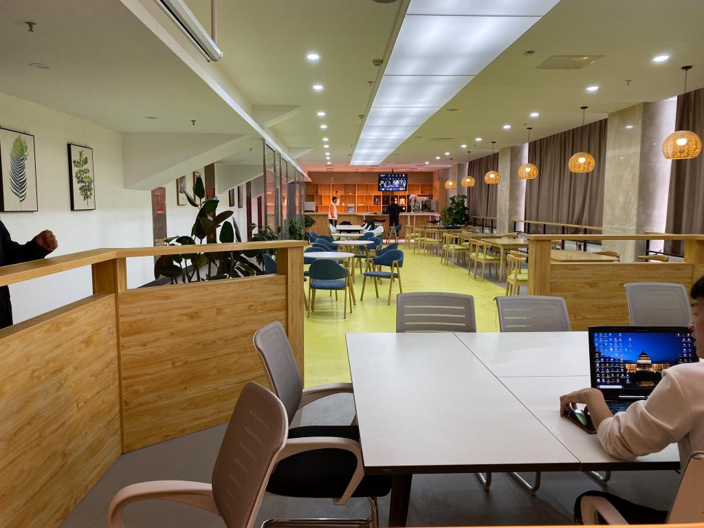 二楼紧临创新创业中心孵化基地,新开辟了一处《创客空间》,面积大约300平米(图19-20)。空间整体风格清新,前台设有咖啡水吧,座位设置灵动,可随机组成多人讨论小组。侧面备有可抽换式的活动宣传展板。空间建设主要思路是为学生提供创新创业运营空间,可随时举办沙龙活动、小组交流、创新创意碰撞讨论平台。目前,运营团队组建完成,场地设备到位,运营尚未开始。