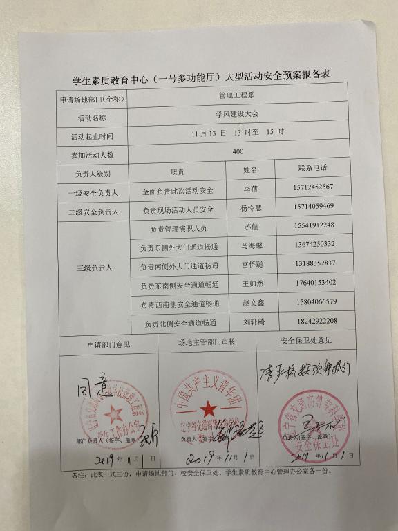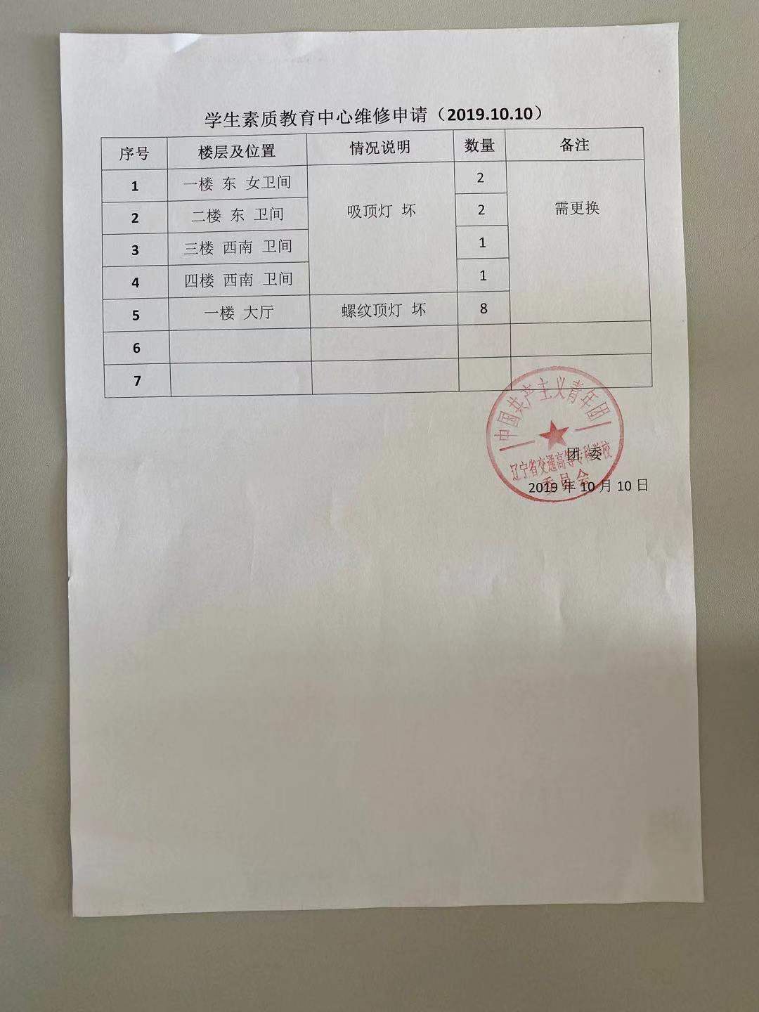 大型活动有《学生素质教育中心大型活动预案报备表》和审批手续(图16-17)、场地各项安全设备设施完好,有报修记录(图18)。