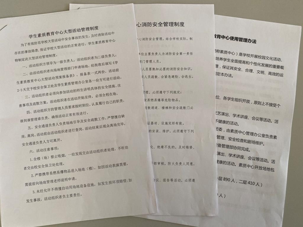 各项管理制度健全(图15),包括:《学生素质教育中心使用管理办法》、学生素质教育中心消防安全管理制度》、《学生素质教育中心大型活动管理制度》。