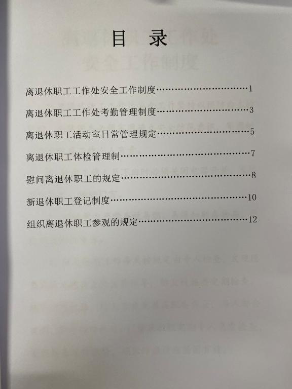 1.工作处自去年分管独立以来,在工作处同志们的努力下,建立了规章制度和自查体系,包括整本的《离退休工作制度汇编》(包括: <离退休职工工作处安全工作制度>、<考勤管理>、<活动室日常管理规定>、<体检管理制度>、<慰问离退休职工的规定>、<新退休职工登记制度>、<组织离退休职工参观的规定>)、《大型活动记录本》、《日常安全检查记录本》、《党员活动记录本》、《日常工作记录本》。安全责任人标志上墙(图4-7)。