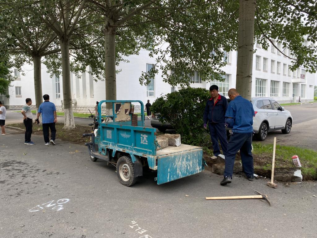 3.教师反映问题督导情况:巡查中,汽车系教师反映,门前绿化带边石在楼体施工后破坏不整,对面树林边经雨水冲刷,泥土漫过甬路。经沟通,后勤管理处立即派人进行了南北绿茵人行道路清理淤泥(图2),对汽车系北侧路边石进行加高维修(图3)。
