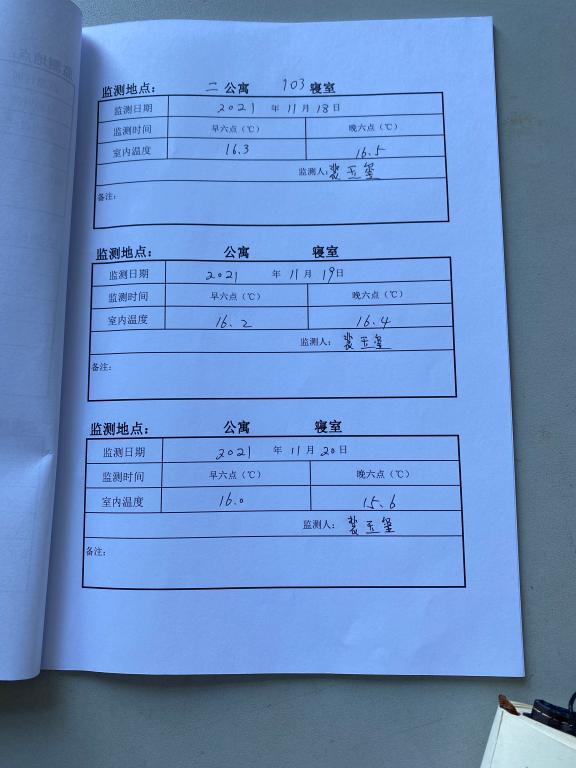 本年度供暖情况检查发现,第一次由于管理人员换岗公寓没有设置温度计。经提醒,第二次公寓在各楼设置了一个测温寝室,个别楼测温寝室可能不是全楼最低温度的那一间。其中,4号公寓暂时未设,以管理员办公室为监测点。