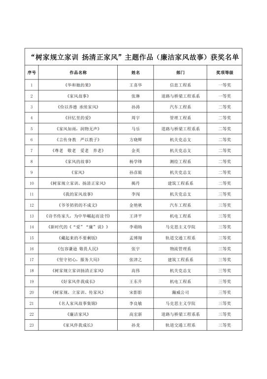 活动开展以来,各基层党组织各部门精心组织,全校教职工围绕爱国、修身、诚信、廉洁、勤政、敬业、和谐、孝道、勤俭、励志等方面内容,结合自己的家庭实际,积极参与,踊跃报送作品。活动共征集到廉洁家风故事、廉洁家书、廉洁家训等作品近百项。学校纪委组织专家对征集作品进行评比,最终评选出廉洁家风故事、廉洁家书、廉洁家训一、二、三等奖作品若干(见名单)。
