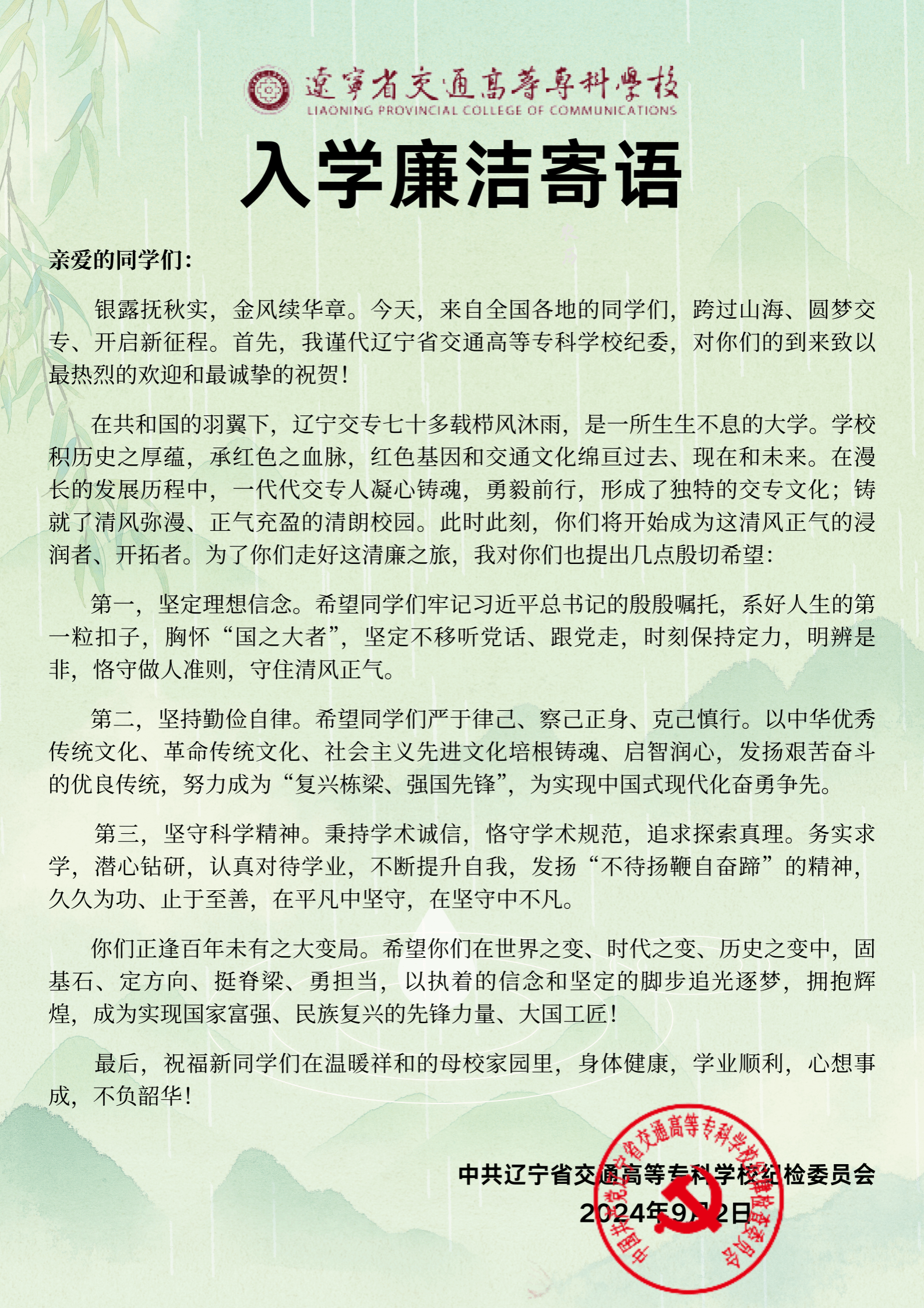 9月2日,是我校2024级新生入学的日子。祝贺你们成为辽宁交专的一份子。山河相隔,翘首以盼,在这个美好且难忘的夏末,我们相遇了。人生海海,山山而川。此前翻山而过,今后皆是明月清风。值此开学之际,学校纪委编制了廉洁寄语,愿全体2024级新生,秉清廉之风,践自律之行!