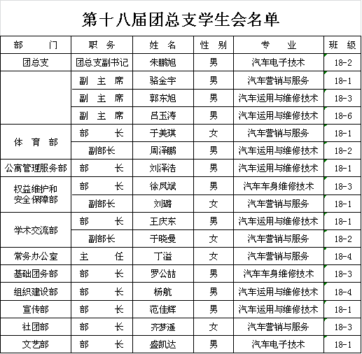 汽车工程系第十八届团总支学生会副部长以上学生干部名单