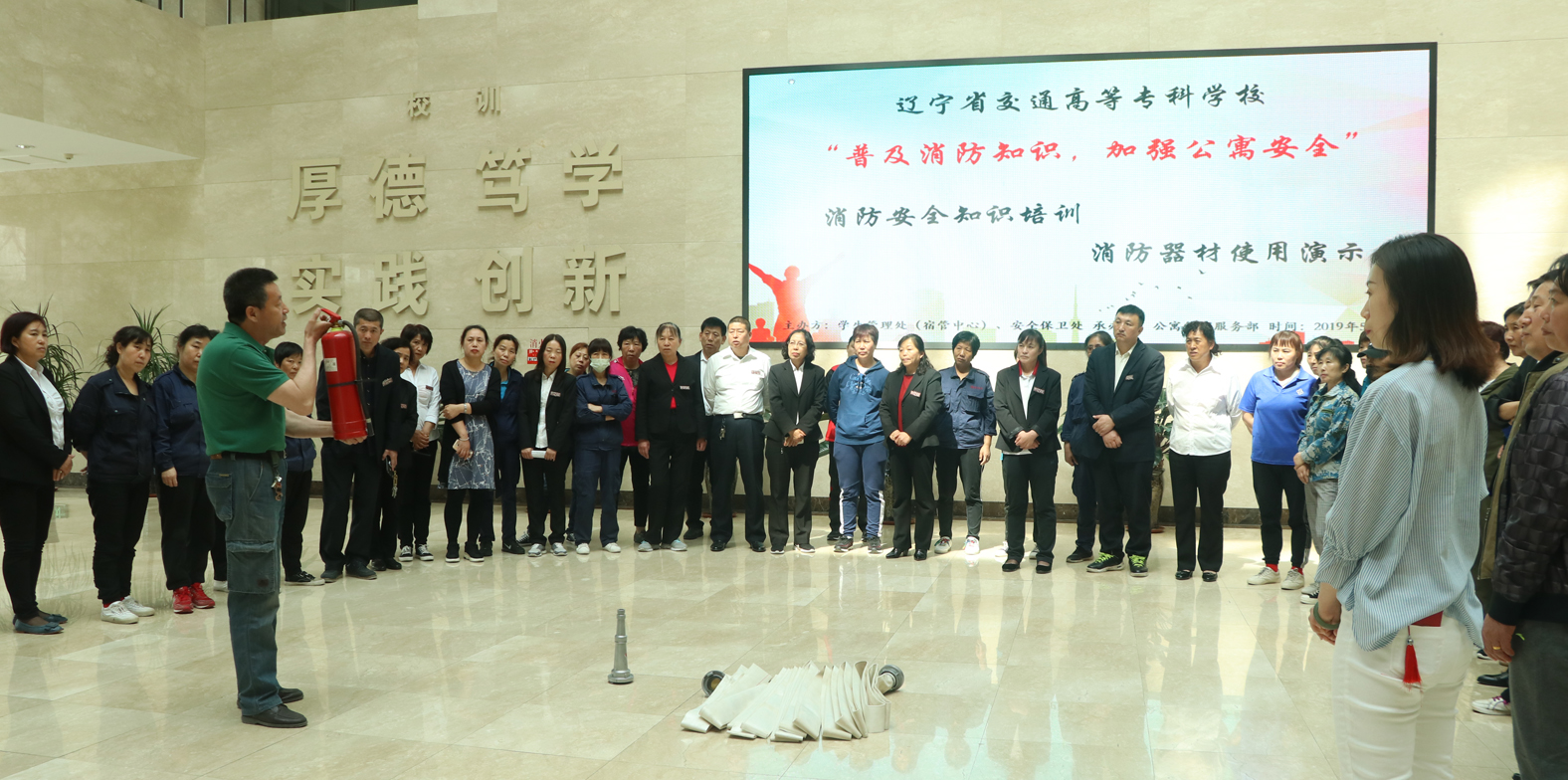 5月15日9点30分,校学生管理处(宿管中心)联合安全保卫处举办了“普及消防知识,加强公寓安全”消防安全知识培训活动。为了切实加强我校学生公寓的消防安全管理,增强职工安全意识,有效地预防火灾,为学生创建一个安全、和谐的公寓环境,宿管中心联合安全保卫处在素质中心一楼大厅对全体宿管员进行了一次消防安全培训。培训现场对灭火器材的使用演示、出现火情的第一时间处理方法、火情的扑救注意事项等问题进行了细致讲解。...