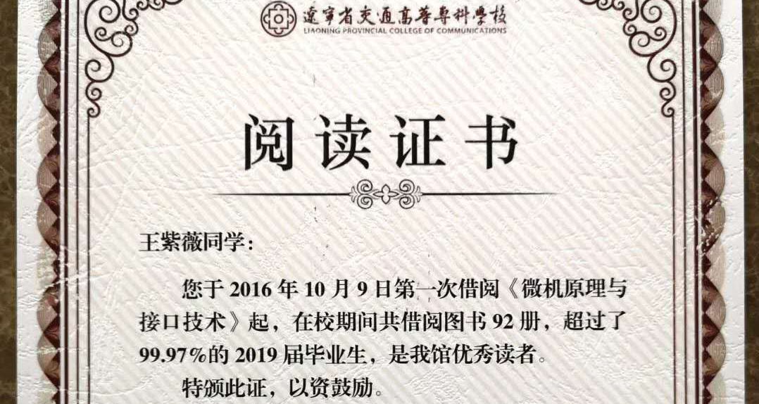 在2019届毕业生办理离校手续,准备奔赴就业岗位,开启人生美好篇章的前夕,图书馆汇总同学们三年来的借阅情况,向优秀读者发放《阅读证书》,鼓励他们离校不离书,养成终身阅读的良好素养。图书馆信息技术部通过借阅管理系统,查询整理汇总了2019届3506名同学三年来的借阅情况,包括图书借阅总册数、首次借阅图书名称、首次借阅时间、借阅量年级总排名等信息。图书馆办公室与信息工程系士官班同学一起设计制作了《阅读证书》,...
