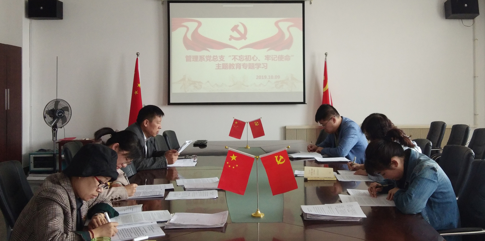 “不忘初心,牢记使命”主题教育活动开展以来,管理系党总支认真贯彻校党委一系列部署,立足全面提升我系党员干部对习近平新时代中国特色社会主义理论的理解和认识,提高政治站位,发挥带头作用,2019年9月8日,系党总支成员集中学习了《中共中央关于加强党的政治建设的意见》。总支书记富浩、副书记张宁领学。集中学习前所有总支成员自行打印了《中共中央关于加强党的政治建设的意见》,党总支书记富浩、副书记张宁以读原文、...