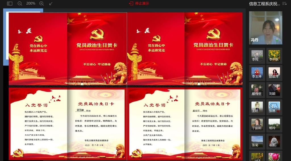 为响应校党委的工作安排,按照学校疫情防控要求,结合校党委工作部署,7月7日,信息工程系教工党支部组织全体教工党员召开“牢记“政治生日”、致敬抗疫英雄”党员活动。活动由党支部书记冯丹主持。正值中国共产党建党99周年纪念日到来之际,信息工程系教工支部郗传平、孟亚静两位老师也迎来了自己的“政治生日”。支部为他们送上了一份“政治生日贺卡”作为“生日礼物”。贺卡上标注入党时间、激励寄语,使每名党员充满荣誉感...
