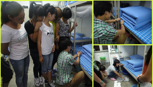 2013级新生军训延后,如何保证新生寝室内务整理过关,成为新生寝室管理的重头戏。