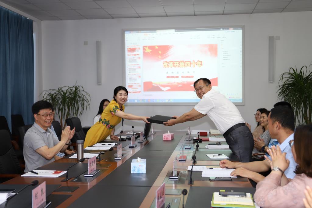 随后,机关一党支部全体党员共同为罗恒岩同志举行了简短而又温馨的退休欢送仪式。2019年是罗恒岩同志在学校工作的第30个年头,也是罗恒岩同志退休前最后一次参加机关一党支部组织生活。支部全体党员为罗恒岩同志精心的准备了电子视频相册、具有特殊意义的礼物和满满的祝福。支部书记崔笑首先结合《条例》内容,从保持党员先进性,发挥党员先锋模范作用方面讲述了她眼中的这位老党员、老前辈。其他党员同志也纷纷回忆了与罗恒岩同志在工作中的点点滴滴,畅谈了罗恒岩同志在工作中一心为公、乐于助人的生活片段和感人瞬间,表达了对老同志的敬意。
