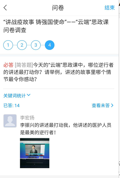 这堂生动感人的“云端”思政课,在我校师生中引起强烈反响。师生代表积极参与研讨本次思政课所传达的精神品质,他们深入学习研讨“抗疫”精神,深刻感悟“逆行者们”的家国情怀、高尚品质,结合自身进行思考展开讨论,思政部针对本次思政课组织学生开展了问卷调查,对本次思政课进行系统的总结,为本次课程画上圆满的句号。