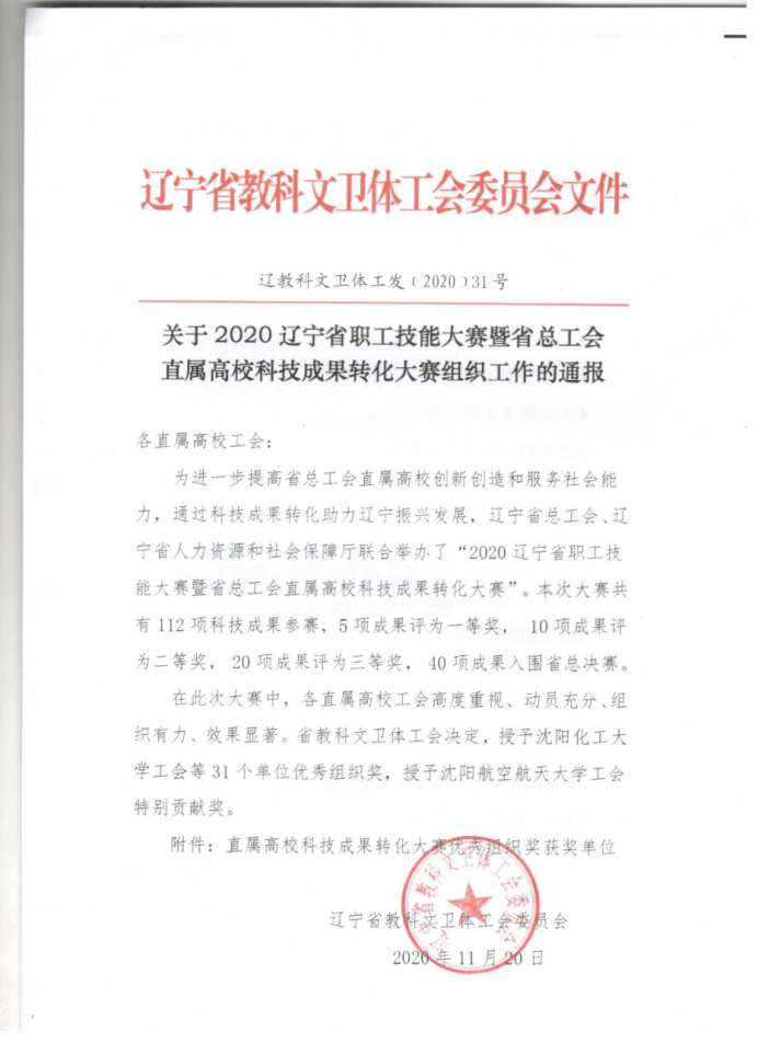 12月8日上午,2020年辽宁省职工技能大赛暨省总工会直属高校科技成果转化大赛颁奖典礼在沈阳航空航空大学举行。我校物流管理系谢元芒主持申报的“智能化出租汽车执法监督系统”项目荣获三等奖,信息工程系金雷老师主持申报的“新型压电式触觉传感器研究与应用”项目荣获入围决赛奖,我校荣获优秀组织奖。