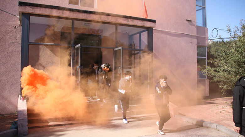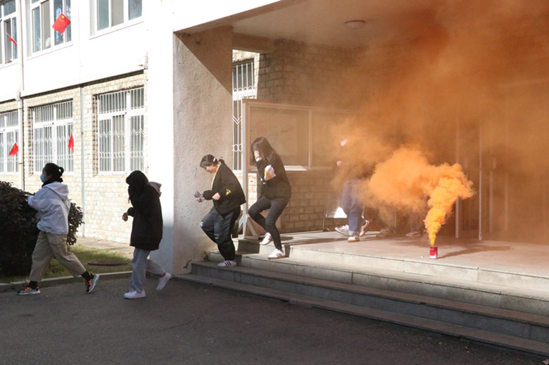 最后,在消防安全疏散逃生环节,消防警报响起,安全保卫处工作人员指挥参加演练的学生在模拟浓烟中撤离,同学们用湿毛巾捂住口鼻,弯腰前进,以最快的速度疏散撤离到安全地点。