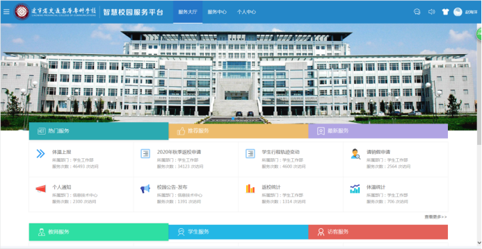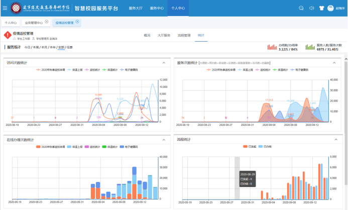 系统还采用“重点地区智能名单”功能实现了对学生健康信息的智能动态管理。如全国某地区突发疫情状况,管理员通过更新重点地区名单,系统即可完成对学生风险的实时标注,对于存在任何一类风险记录的学生,系统将对相关学生的信息进行实时预警,确保学生在交专校园内的平安、健康。“一站式服务大厅”上线后,创建了学生管理工作服务业务包,服务在校6800名学生,访问总数达到12.27万人次,流程发起数3.7万次,平台响应31.4万次,极大程度的提高了学生管理工作的效率,做到了事前可控、事中可管、事后可查,有效的发挥了智慧校园大数据应有的作用。