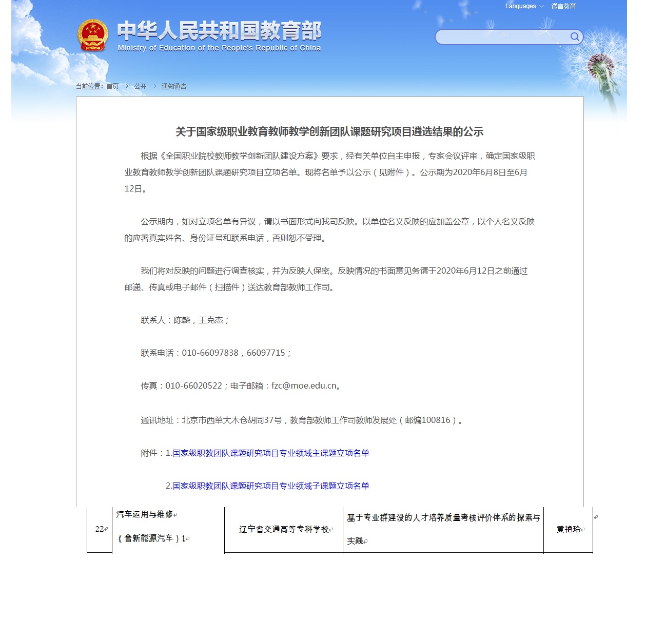 近日,教育部教师工作司发布了《关于国家级职业教育教师教学创新团队课题研究项目遴选结果的公示》,我校由黄艳玲主持的《基于专业群建设的人才培养质量考核评价体系的探索与实践》成功入选国家级职教团队课题研究项目专业领域子课题,全国共入选65项。