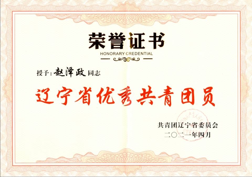 赵泽政“辽宁省优秀共青团员”荣誉称号