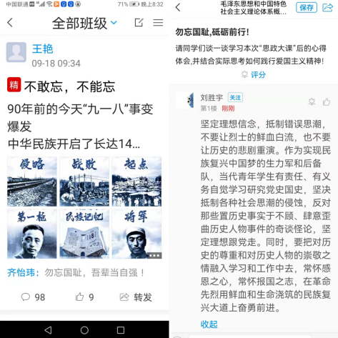 本次思政大课以沈阳“九·一八”历史博物馆中有代表性的展品、文物为载体,带领学生重温了那段东北人民浴血抗日的不屈岁月。课程的学习在师生中引起强烈反响和热议,思政部教师在课程结束后依托学习通平台设置了“勿忘‘九一八’”的相关讨论话题,各年级学生积极参与回帖,倾诉学习感受。学生们为中国人民,尤其是东北抗日联军在长达十四年的时间里于白山黑水间顽强抵抗日寇残暴侵略的精神所感动,大家纷纷留言表示要铭记历史,珍惜和平,在新时代继续传承弘扬伟大的抗战精神,坚定不移跟党走,在民族复兴的道路上奋勇前进。