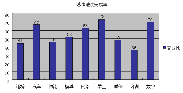 根据示范校办公室2008.9.8《关于强力推进示范校建设、加强进度管理有关规定的通知》的要求,2008年10月27-31日示范校建设办公室对各项目单位10月15日期的自检工作进行了全面的复查。根据检查结果看,从9月15日到10月15日期间,我校示范校建设总体进度(53%)没有变化,主要原因是有的原完成率很高的子项目在此次检查时有所下降。全部9个项目与上期相比道桥、学生、质保和数字分别上升4、9、9、和5个百分点,汽车和模具没有变化,物流、网络和培训各下降1个百分点,进展最快的是学生综合素质培养模式和教育教学质量保证与评价体系。5个重点建设专业的实验实训条件建设、师资队伍建设和课程建设总体完成率分别只有46%、70%和49%。
