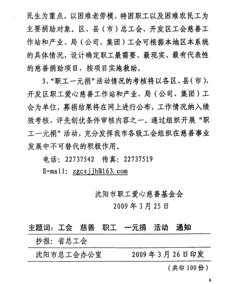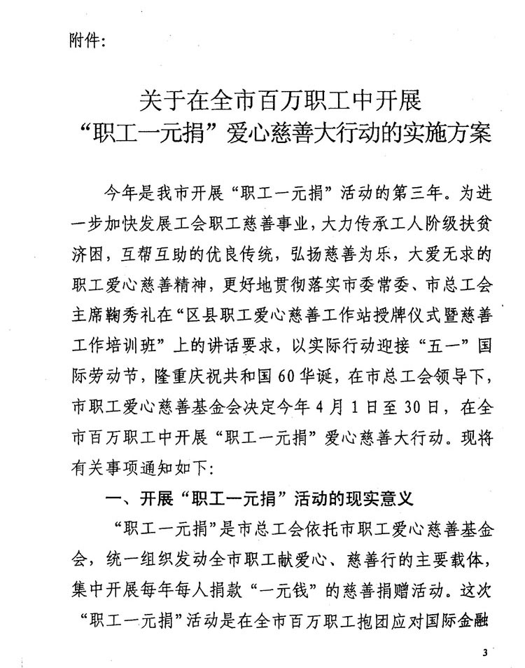 按照上级工会的要求,我校在全校教职工中开展“职工一元捐”活动。请各部门按照上级文件精神,组织本部门职工开展捐款活动,并将捐款于下周一(5月18日)下班前送到工会办公室(A楼813室)。