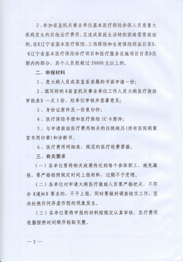根据省人力资源和社会保障厅、省财政厅《关于调整省直机关事业单位工作人员大病医疗救助办法的通知》(辽人社【2012】319号)和《辽宁省人力资源和社会保障厅政务公开行政权力事项》精神,省社保局将开展2013年省直机关事业单位工作人员大病医疗救助工作。具体申报范围、申报材料和相关要求详见文件,相关人员于6月23日前将申报材料送交人力资源处。