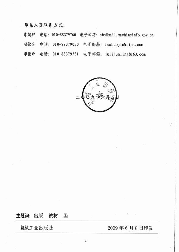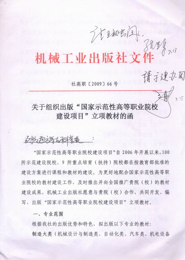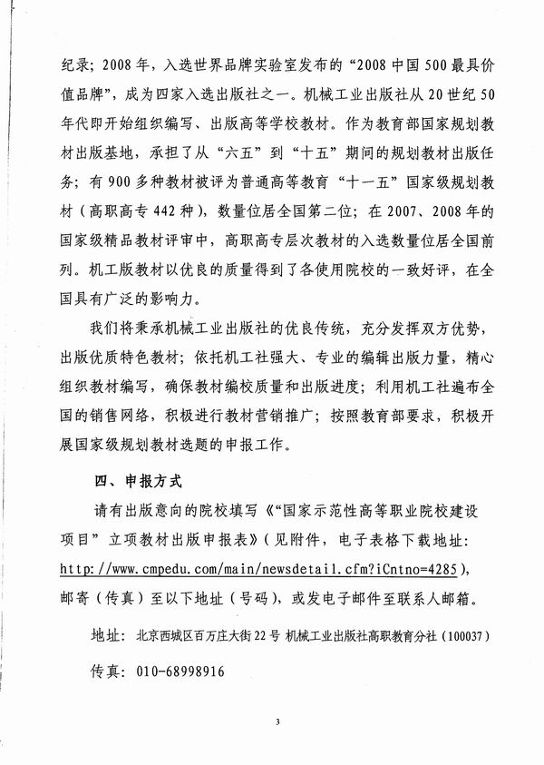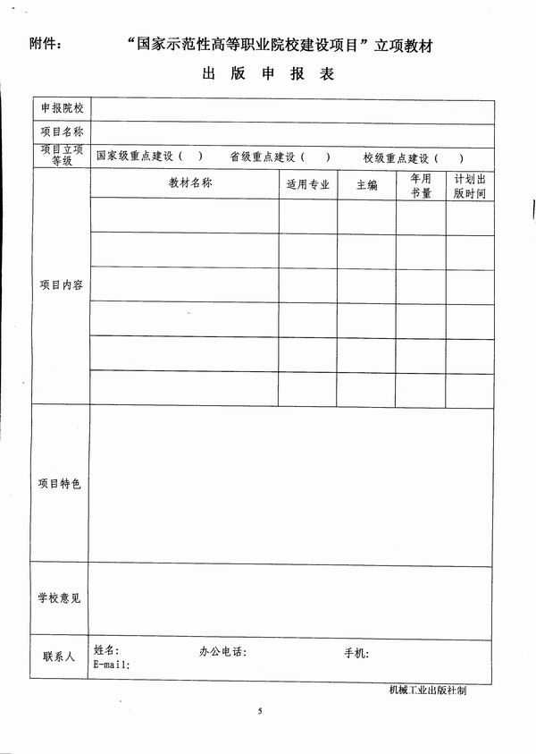 请阅读“关于组织出版‘国家示范性高等职业院校建设项目’立项教材的函”的文件,有意向出版此类教材的部门请按照附件“出版申报表”的形式自制申报表,认真填写“项目内容”和“项目特色”两项内容(自行做表即可),并于7月20日前,将表格电子版发至hans216@163.com ,联系人:孙志强,电话:13889821865。