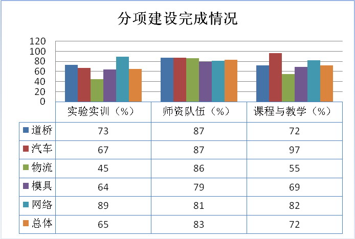 分项建设完成情况如下:目前分项建设较慢的是实验实训项目,总体完成率为65%,进展较快的有:计算机网络技术89%、道路桥梁工程技术73%;师资队伍建设项目稳步推进,目前总体完成率为83%;课程体系与教学内容进展较快的项目有:汽车检测与维修技术97%、计算机网络技术82%。