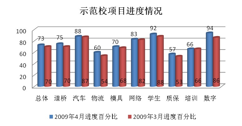 根据示范校建设办公室相关通知的要求,2009年4月15日期的自检工作已经结束,根据各部门上报材料显示,从2009年3月15日到2009年4月15日期间,我校示范校建设总体进度达到73%,进展速度缓慢,相比上期只增加3个百分点。目前进展较快的项目有数字化校园及多媒体教学、学生综合素质培养和汽车检测与维修技术,分别达到94%、92%和88%。物流管理项目进展速度有所提高,目前完成率为60%,相比上期增加了6个百分点。