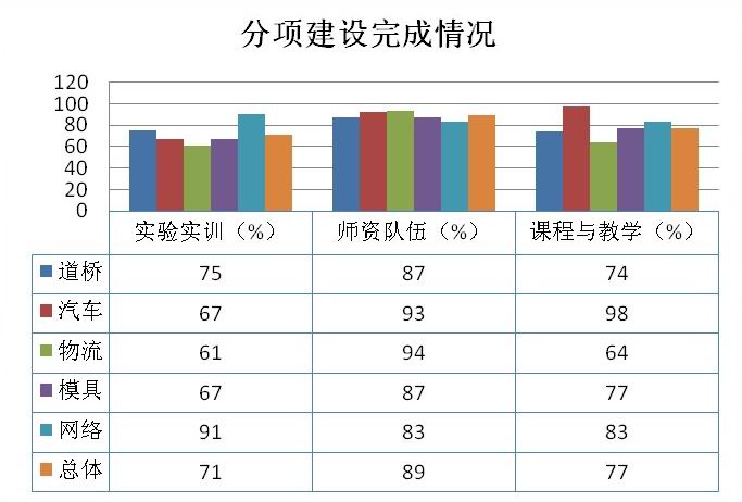 课程体系与教学内容:总体完成率为77%,进展较快的项目有:汽车检测与维修技术98%、计算机网络技术83%。