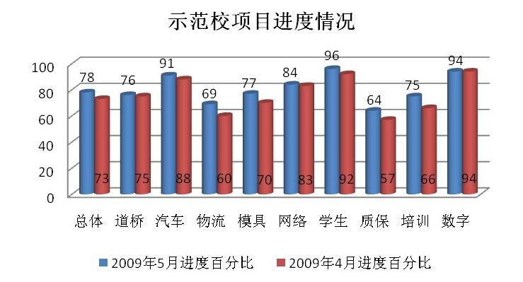 根据示范校建设办公室相关通知的要求,2009年5月15日期的自检工作已经结束,根据各部门上报材料显示,从2009年4月15日到2009年5月15日期间,我校示范校建设总体进度达到78%,相比上期只增加5个百分点。学生综合素质培养、数字化校园及多媒体教学和汽车检测与维修技术三个项目的进度已接近尾声,分别达到96%、94%和91%。三个相对缓慢的项目:物流、质保和培训项目在本阶段进展较快,依次增加了9、7、9个百分点,但总体仍然偏后,还需进一步加快建设速度。