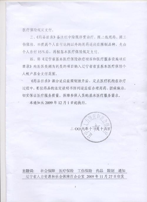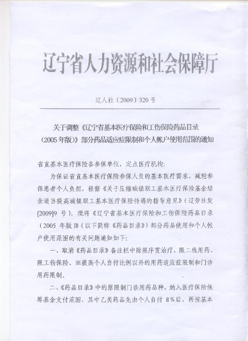 关于调整《辽宁省基本医疗保险和工伤保险药品目录(2005年版)》部分药品适应症限制和个人帐户使用范围的通知