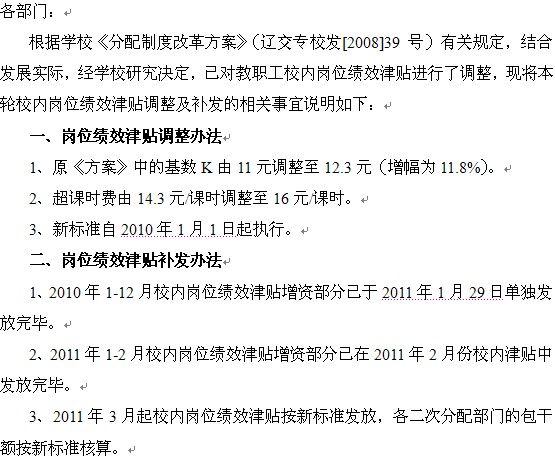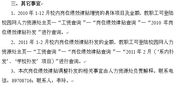 关于2010年校内岗位绩效津贴调整及补发的相关说明