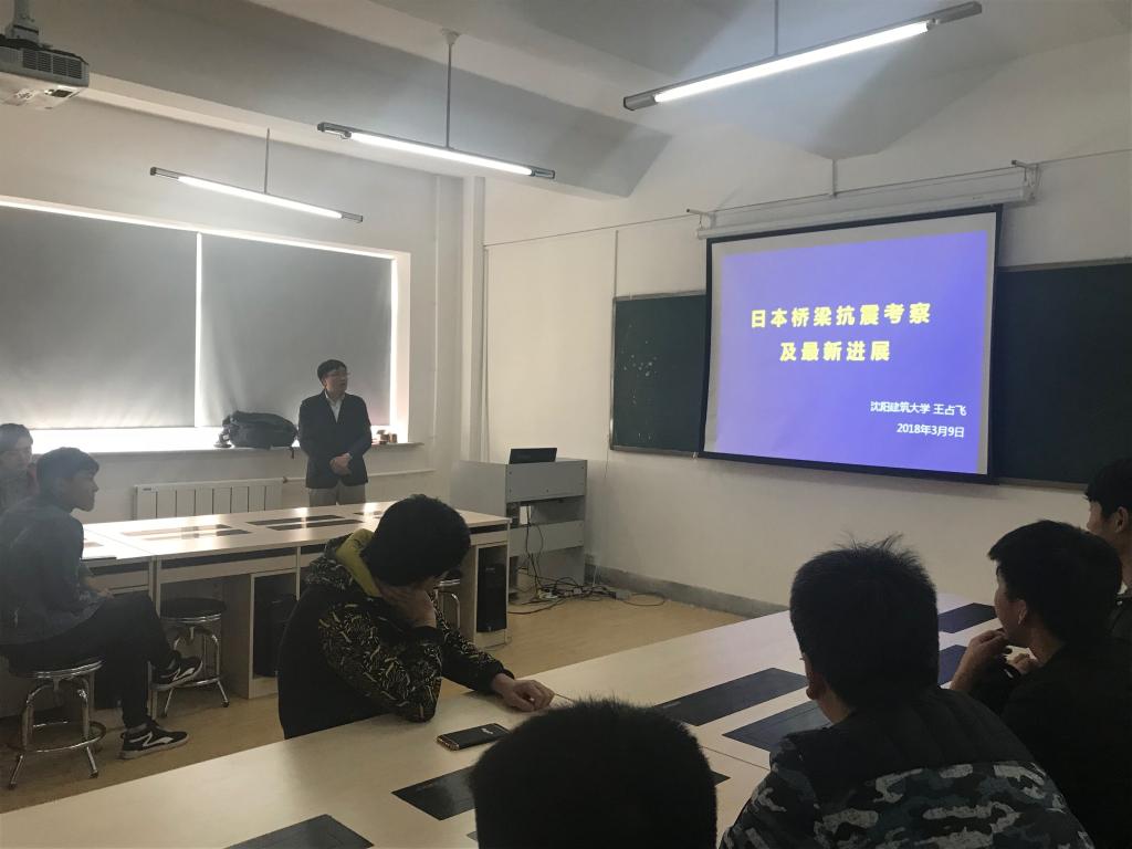 04月09日下午,道桥系邀请沈阳建筑大学土木工程学院道路与轨道交通教研室主任王占飞教授做了 《关于日本桥梁抗震的思考以及最新进展》学术报告,道桥系教师和学生共70人聆听了报告。报告人结合自己在日本留学学习的经历,从日本神户名古屋熊本的简介、1995年神户地震造成的桥梁震害、日本桥梁抗震设计的思考以及试验研究、2016年熊本地震造成的桥梁震害、名古屋市内高架桥梁及加固考察、新型缓冲型防落梁装置的研发、留学日本经历的人间冷暖等七个方面进行深入浅出、图文并茂、生动形象的讲解,并提出我国桥梁抗震的研究发展方向。使大家从日本的桥梁抗震中吸取经验教训,弥补我国桥梁抗震发展的不足具有一定的指导意义。