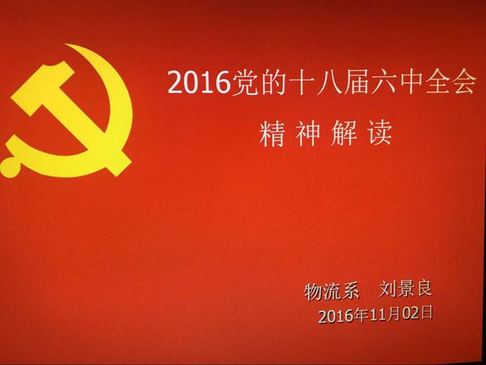 11月2日下午,物流系党总支组织全体党员学习十八届六中全会精神。物流系党总支书记刘景良带领全体党员对十八届六中全会精神进行了解读学习,并要求全体党员紧密团结在以习近平同志为核心的党中央周围,全面深入贯彻十八届六中全会精神,进一步增强政治意识,当好“明白人”; 进一步增强大局意识,当好“正派人”; 进一步增强核心意识,当好“责任人”; 进一步增强看齐意识,当好“带头人”。 要求全体党员要以饱满的政治热情参加“两学一做”学习教育,为全系师生树立学习的榜样,为物流系的发展和学校高职名校建设做出新贡献。