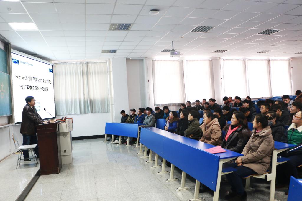 12月21日下午,建筑工程系邀请沈阳东杰环保科技有限公司经理张伦秋作题为《雾化电晕放电处理丁苯橡胶废水研究进展》的学术报告,建筑工程系系主任、书记、教学办主任、给排水专业全体教师以及15级、16级给排水工程技术专业学生共120余人参加了报告会。