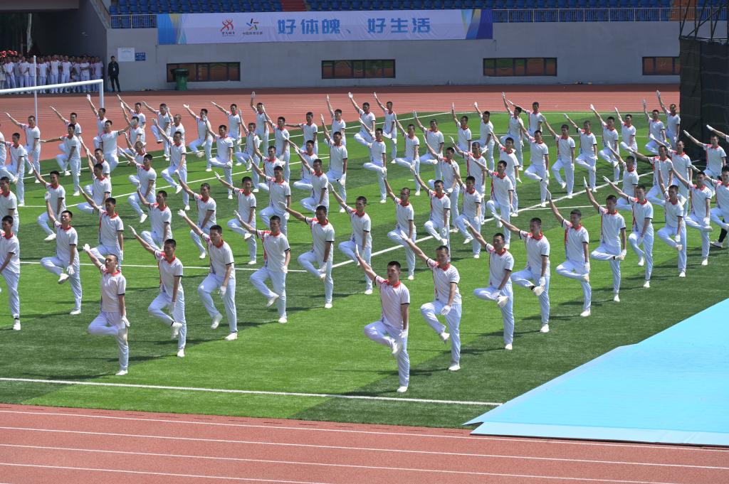 全省共有六所高校参与开幕式演出,我校400余名警士学员受邀全过程参加大赛开幕式表演,多个展演环节中担任中坚力量,展演节目覆盖每个篇章,是参与节目最多的高校。共有10人参加撞球、搏击操、板羽球、手抛球系列序章表演。40人参与了第二篇章彩带龙表演。分别有230人参与了第三篇章的广播操表演和130人参与了第三篇章的氛围营造队形变换表演。90人参与了第四篇章彩旗表演。