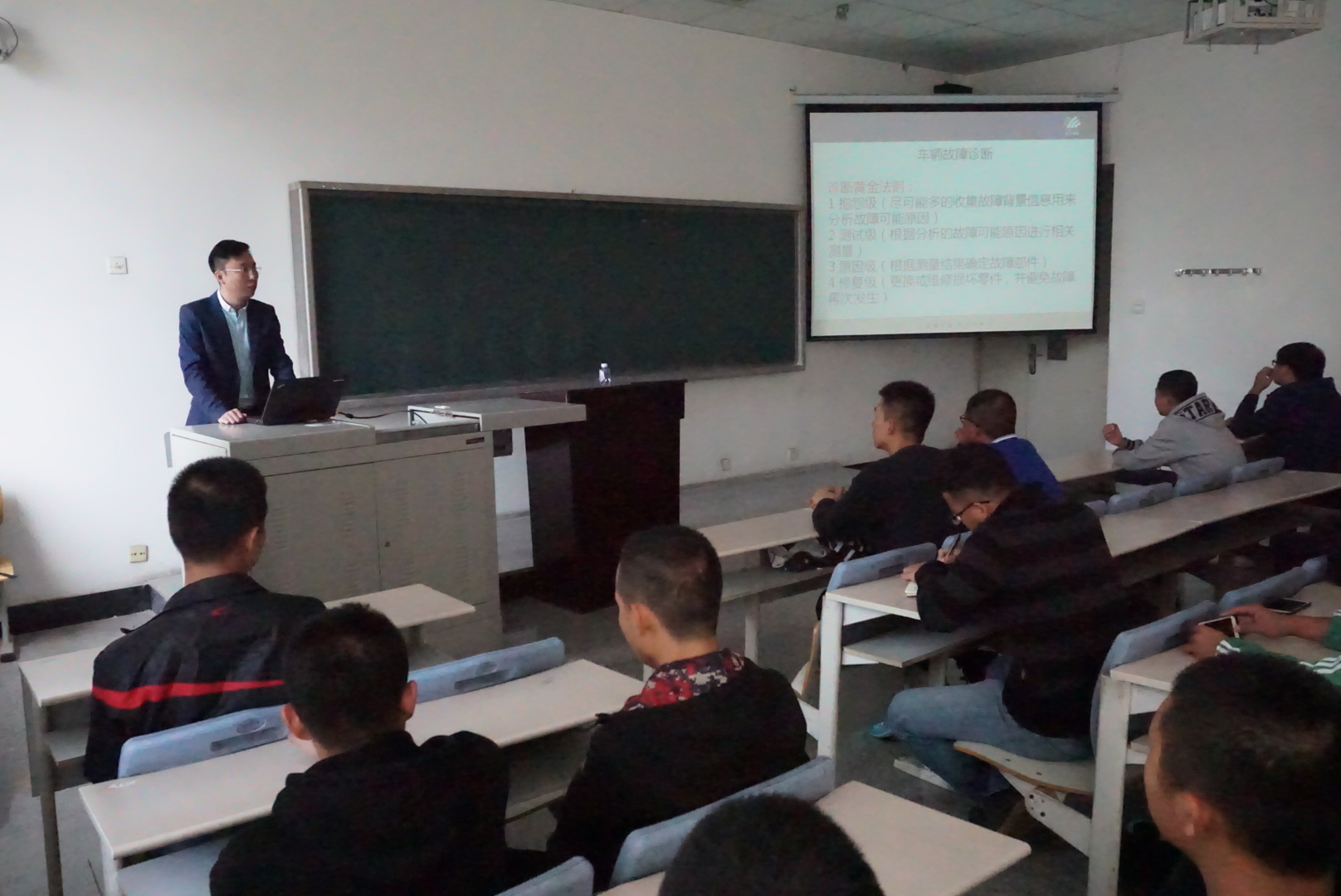 报告主要介绍了汽车故障诊断的基本规律和方法,重点介绍了高端品牌汽车故障诊断的“黄金法则”,通过具体案例的分析,讲解“黄金法则”的运用方法。最后,张经理与同学们分享了汽车维修技术人员的成长历程,与同学们进行了生动活泼的互动。本次报告对学生了解高端品牌汽车的维修工艺以及未来的职业规划都产生了积极的影响。