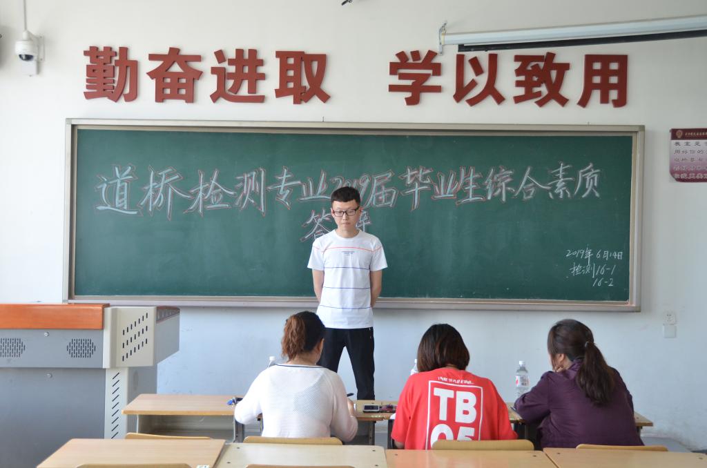 为加强毕业生离校教育和毕业前师生间的交流,检验毕业生社会素质和职业素质,更有针对性地为毕业生做好职业规划指导,2019年6月14日下午,道桥系组织了2019届道桥检测和道桥安全专业毕业生综合素质答辩,其他四个专业分别将在6月18日和6月20日进行。党总支书记于忠涛、党总支副书记李云峰、学生党支部书记杜荣秋、系团总支书记王俊杰、专业辅导员杨江勇、张琳、白雪、专业班主任关超、王海兴、窦玉荣等担任答辩评委并参加了本次答辩。